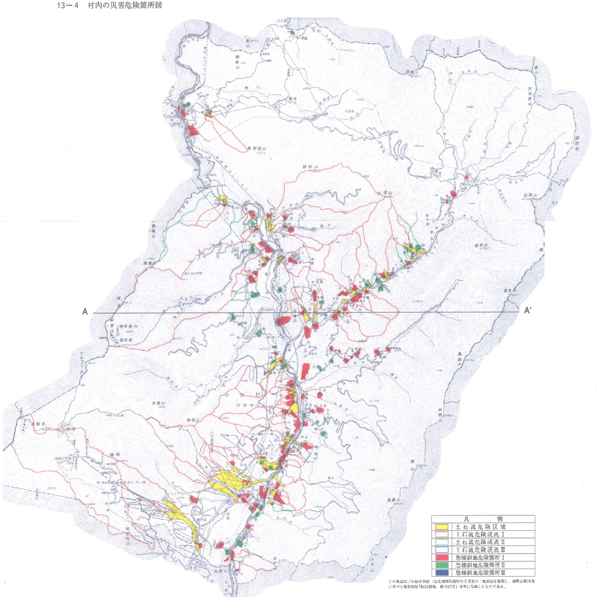 小谷村内には、「土砂災害特別警戒区域」が224箇所、「土砂災害危険箇所」が246箇所、「土砂災害警戒区域」の指定を受けている区域が287箇所あります。