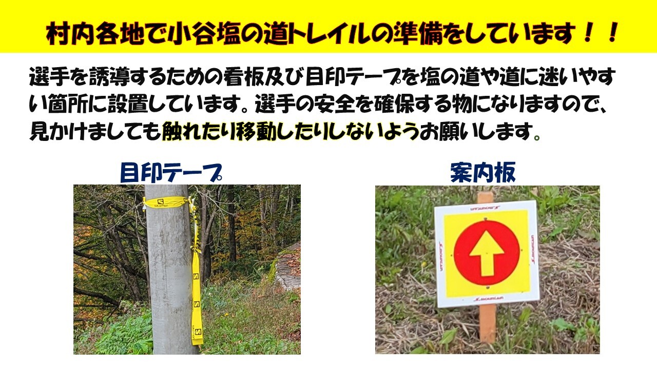 選手を誘導するための看板及び目印テープを塩の道や道に迷いやすい箇所に設置しています。選手の安全を確保する物になりますので、見かけましても触れたり移動したりしないようお願いします。