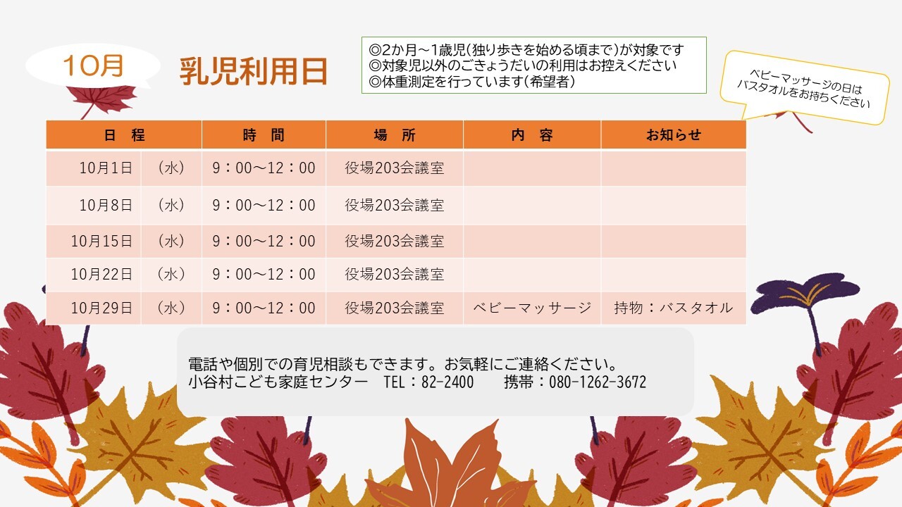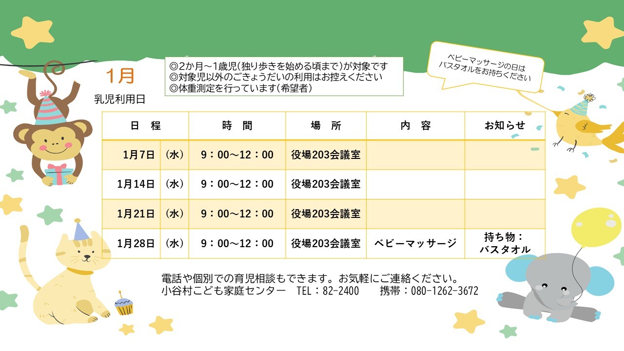 電話や個別での育児相談等もできます。お気軽にご連絡ください。 携帯:080-1262-3672