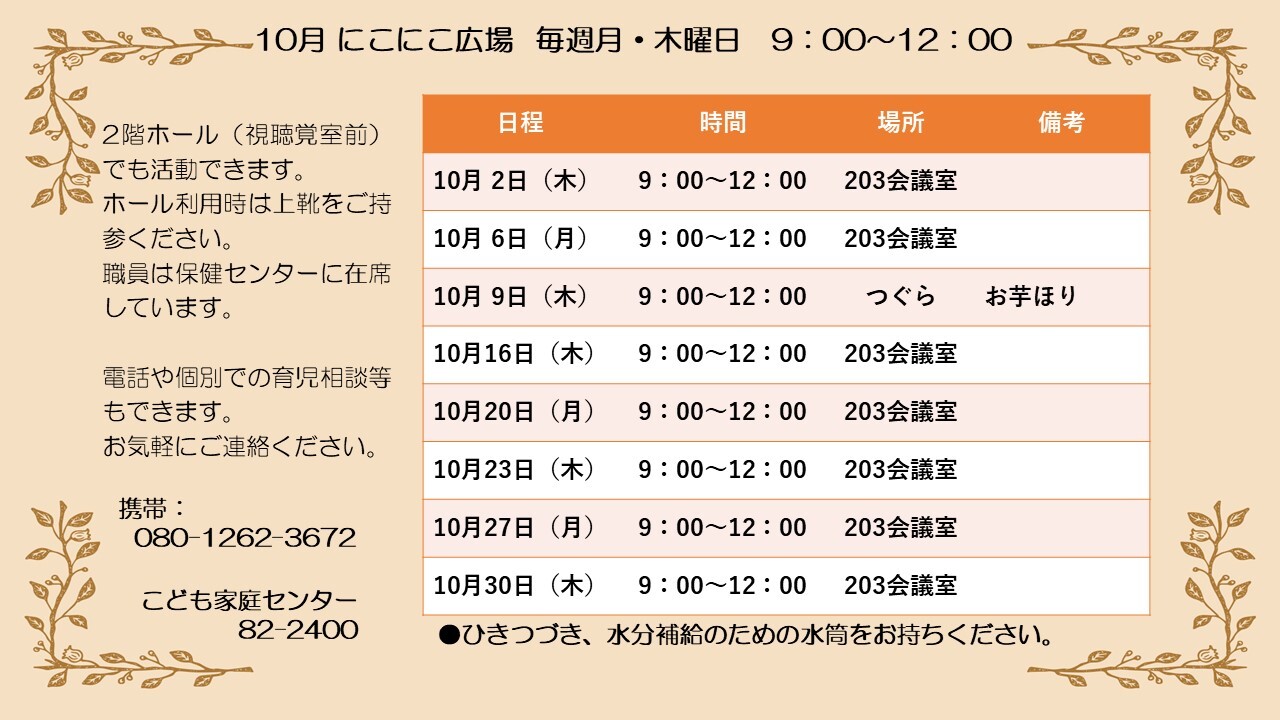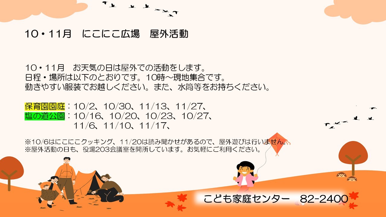 ※10/6はにこにこクッキング、11/20は読み聞かせがあるので、屋外遊びは行いません。