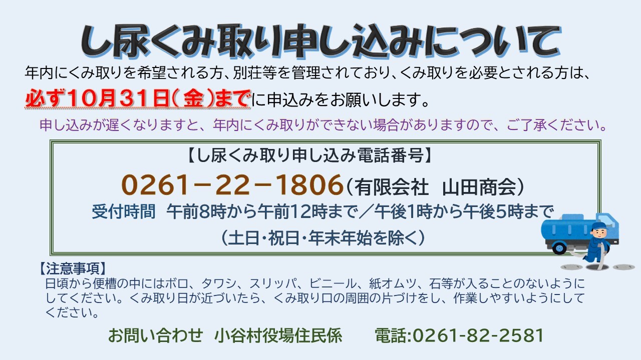 年内にくみ取りを希望される方、別荘等を管理されており、くみ取りを必要とされる方は、必ず10月31日(金)までに申し込みをお願いします。