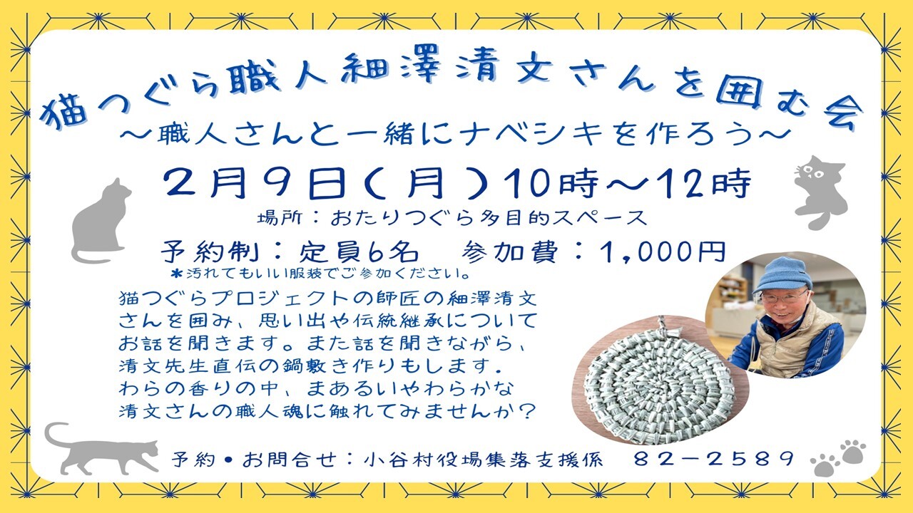 猫つぐらプロジェクトの師匠の細澤清文さんを囲み、思い出や伝統継承についてお話うぃ聞きます。ま・た話を聞きながら、清文先生直伝の鍋敷き作りもします。わらの香りの中、まあるいやわらかな清文さんの職人魂に触れてみませんか?
