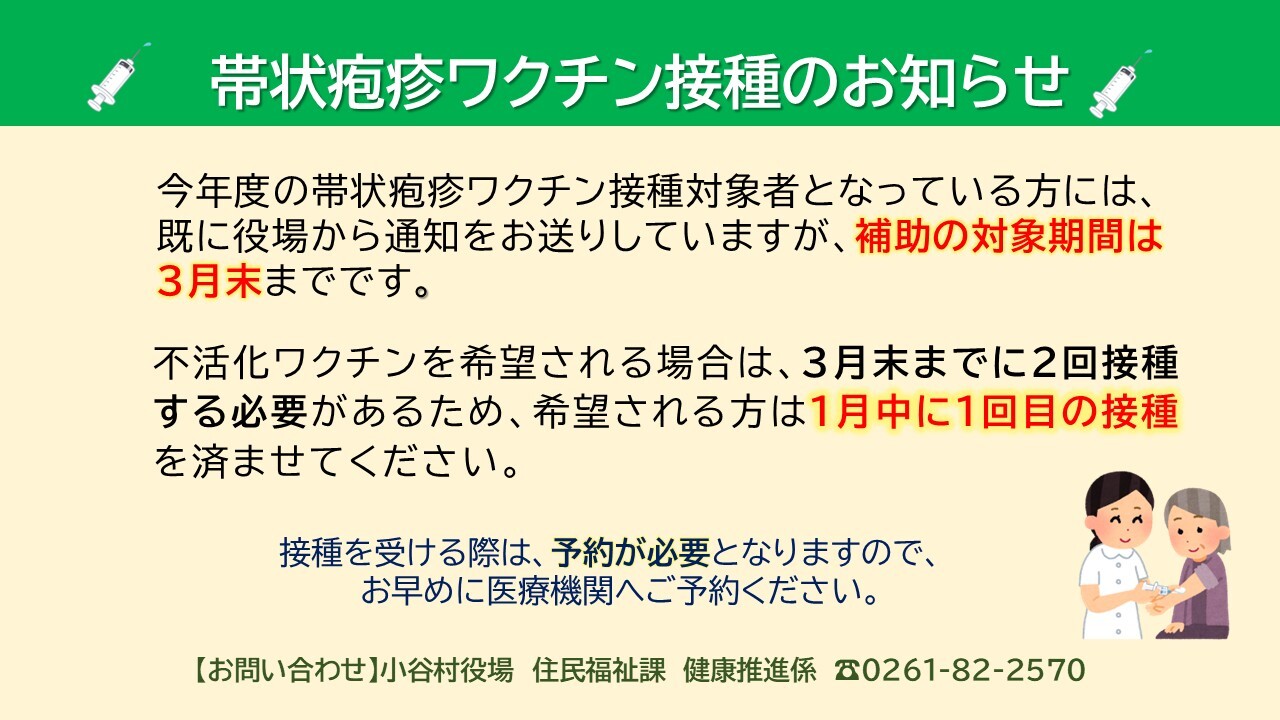 今年度の帯状疱疹ワクチン接種対象者となっている方には、既に役場から通知をお送りしていますが、補助の対象期間は3月末までです。