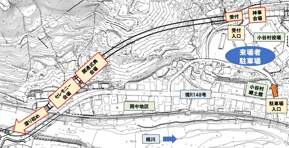 これに伴い、小谷村では国道148号整備促進期成同盟会との共催により、雨中月岡バイパス開通セレモニーを下記のとおり開催いたします。