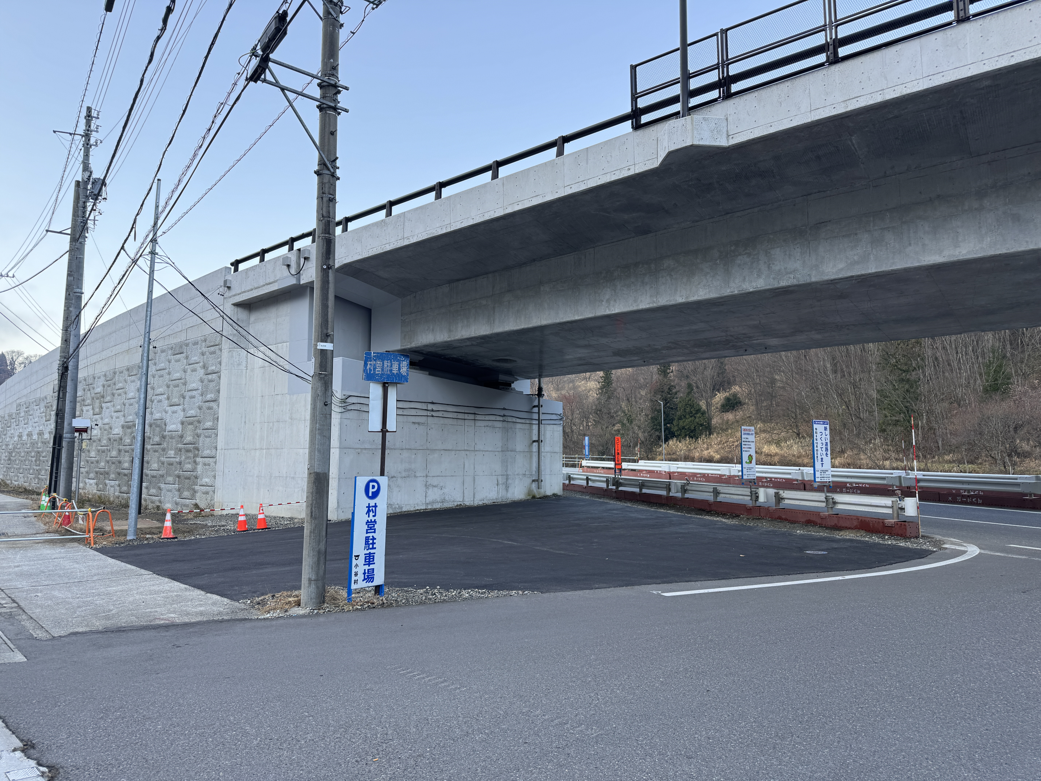 雨中バイパス工事が完了したことに伴い、新バイパス橋梁下(雨月橋下)に村営駐車場が移動となりました。従前の村営駐車場跡地は国道除雪の排雪帯として利用されるため、駐車規制されていますのでご注意ください。